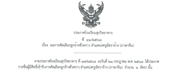 ประกาศโรงเรียนสุรวิทยาคาร เรื่อง ผลการคัดเลือกลูกจ้างชั่วคราว ตำแหน่งครูอัตราจ้าง (ภาษาจีน) ** ดังเอกสารแนบท้าย ...
