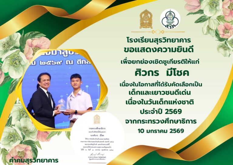 โรงเรียนสุรวิทยาคาร ขอแสดงความยินดีกับนักเรียนที่ได้รับคัดเลือกเป็นเด็กดีเด่น "วันเด็กแห่งชาติ ประจำปี 2569" ดังนี้ นายศิวกร มีโชค นักเรียนชั้นม.5/2 จากกระทรวงศึกษาธิการ นางสาวคีตภัทร ช่องวารินทร์ นักเรียนชั้นม.3/3 จากเทศบาลเมืองสุรินทร์ นางสาวชนากานต์ สายศร นักเรียนชั้น ม.3/3 จากเทศบาลเมืองสุรินทร์ ...