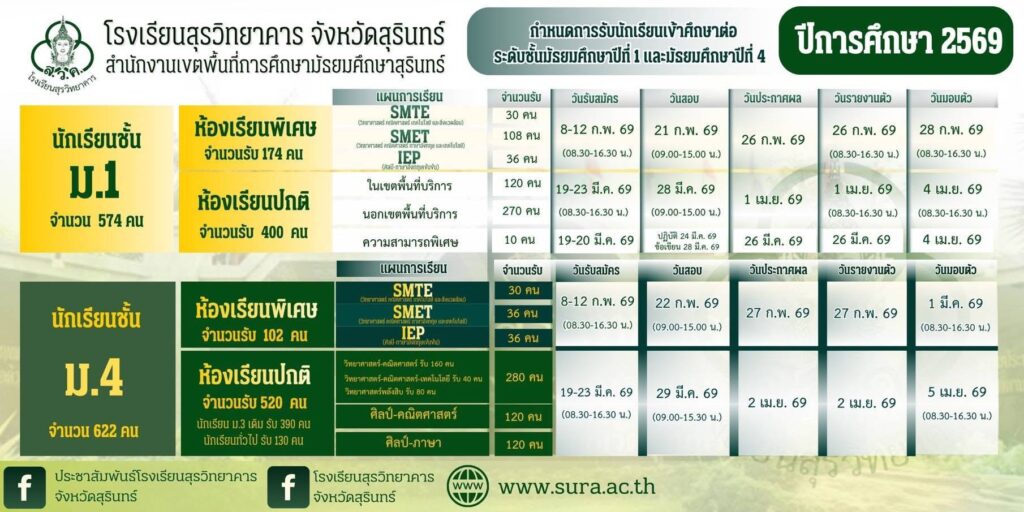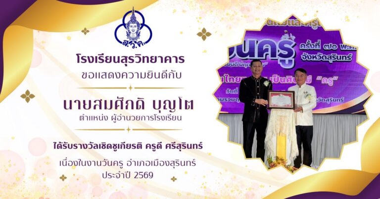 โรงเรียนสุรวิทยาคาร ขอแสดงความยินดีกับผู้บริหาร และคณะครูกับรางวัลอันทรงคุณค่า เนื่องในวันครู ประจำปี 2569 "ครูดี ศรีสุรินทร์" ณ หอประชุมรวมฤทัยธำรงค์ โรงเรียนสิรินธร ...