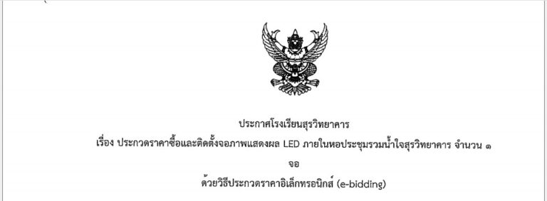 ประกาศโรงเรียนสุรวิทยาคาร เรื่อง ประกวดราคาซื้อและติดตั้งจอภาพแสดงผล LED ภายในหอประชุมรวมน้ำใจสุรวิทยาคาร จำนวน 1 จอ ด้วยวิธีประกวดราคาอิเล็กทรอนิกส์ (e-bidding) ** ดังเอกสารแนบ img-114035540 ...