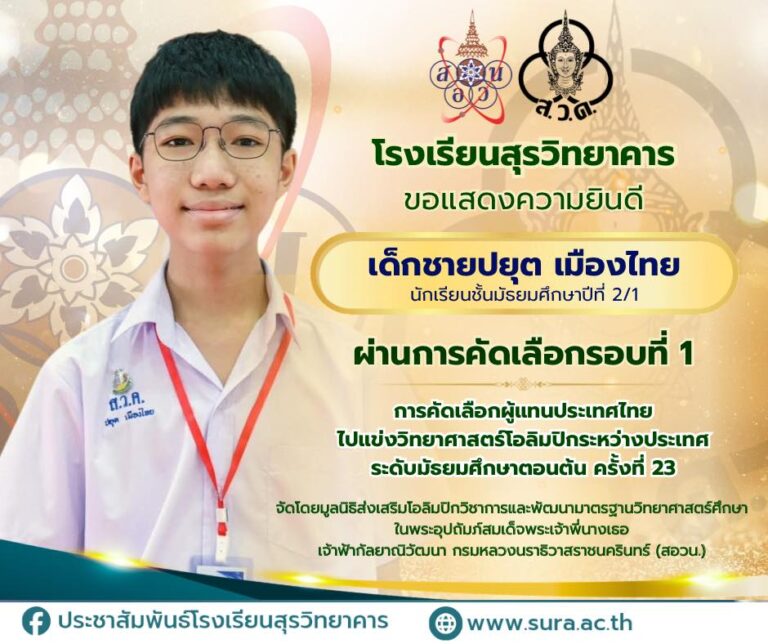 โรงเรียนสุรวิทยาคารขอแสดงความยินดีกับเด็กชายปยุต เมืองไทย ม.2/1 ได้ผ่านการคัดเลือกผู้แทนประเทศไทย ไปแข่งขันวิทยาศาสตร์โอลิมปิก ระหว่างประเทศ ในโอกาสที่ ผ่านการคัดเลือกผู้แทนประเทศไทย ไปแข่งขันวิทยาศาสตร์โอลิมปิก ระหว่างประเทศ ...