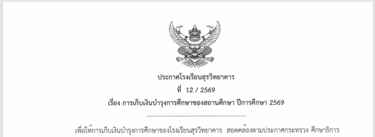 ประกาศโรงเรียนสุรวิทยาคาร ที่ 12/2569 เรื่อง การเก็บเงินบำรุงการศึกษาของสถานศึกษา ปีการศึกษา 2569 ** ดังรายละเอียดแนบท้าย ประกาศการเก็บเงินบำรุงการศึกษาปีการศึกษ ...