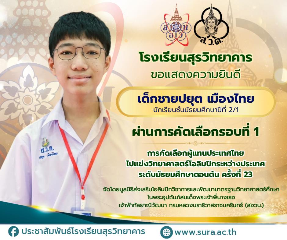 โรงเรียนสุรวิทยาคารขอแสดงความยินดีกับเด็กชายปยุต เมืองไทย ม.2/1 ได้ผ่านการคัดเลือกผู้แทนประเทศไทย ไปแข่งขันวิทยาศาสตร์โอลิมปิก ระหว่างประเทศ