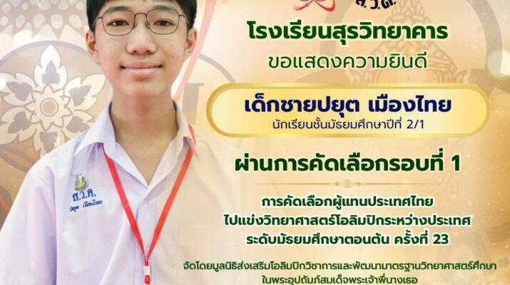 โรงเรียนสุรวิทยาคารขอแสดงความยินดีกับเด็กชายปยุต เมืองไทย ม.2/1 ได้ผ่านการคัดเลือกผู้แทนประเทศไทย ไปแข่งขันวิทยาศาสตร์โอลิมปิก ระหว่างประเทศ