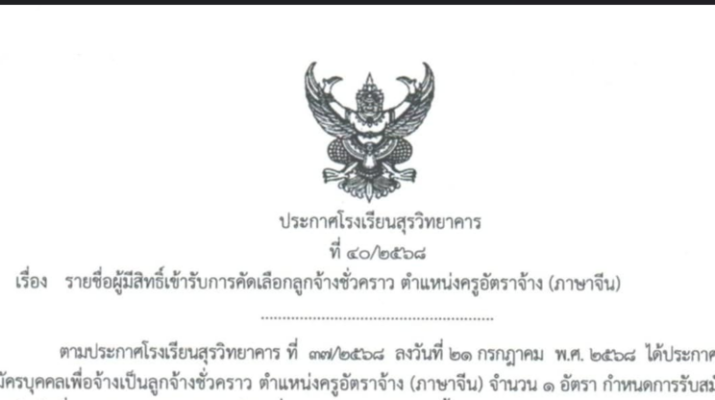 ประกาศโรงเรียนสุรวิทยาคาร ที่ 40/2568 เรื่อง รายชื่อผู้มีสิทธิ์เข้ารับการคัดเลือกลูกจ้างชั่วคราว ตำแหน่ง ครูอัตราจ้าง (ภาษาจีน) ** ดังเอกสารแนบท้าย