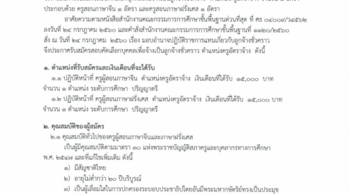ประกาศรับสมัครครูอัตราจ้างภาษาจีนและภาษาฝรั่งเศส จำนวน 2 อัตรา