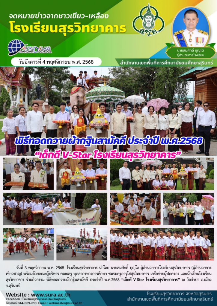 วันที่ 3 พฤศจิกายน 2568 โรงเรียนสุรวิทยาคาร โดยผู้อำนวยการ คณะครู บุคลากร ตัวแทนนักเรียนโดยชั้นมัธยมศึกษาปีที่ 5 พร้อมด้วยชมรมครูอาวุโสสุรวิทยาคาร เครือข่ายผู้ปกครองนักเรียน และอุบาสก อุบาสิการ่วมพิธีทอดถวายผ้ากฐินสามัคคี เด็กดี V-Star  ประจำปีการศึกษา 2568 ณ วัดจำปา อ.เมือง จ.สุรินทร์