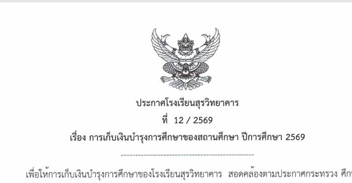 กลุ่มบริหารงบประมาณ 11 Feb 202611 Feb 2026 เงินบำรุงการศึกษา ปีการศึกษา 2569 Posted By: webmaster ประกาศโรงเรียนสุรวิทยาคาร ที่ 12/2569 เรื่อง การเก็บเงินบำรุงการศึกษาของสถานศึกษา ปีการศึกษา 2569 ** ดังรายละเอียดแนบท้าย ประกาศการเก็บเงินบำรุงการศึกษาปีการศึกษ Post Views: 31