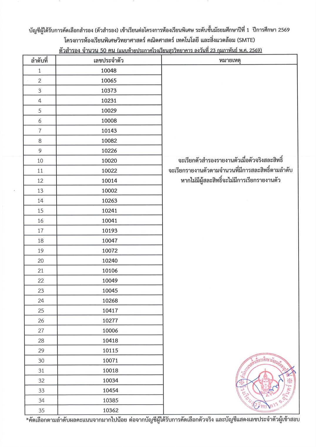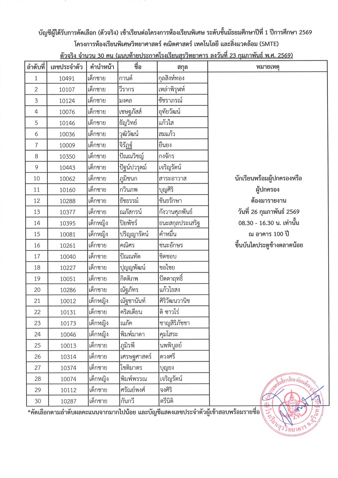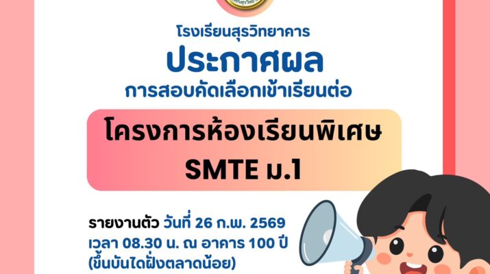 กลุ่มบริหารวิชาการ ข่าวประชาสัมพันธ์ 23 Feb 202623 Feb 2026 ประกาศผลการสอบคัดเลือกห้องเรียนพิเศษ SMTE ชั้นมัธยมศึกษาปีที่ 1 ปีการศึกษา 2569 Posted By: webmaster ประกาศผลการสอบคัดเลือกห้องเรียนพิเศษ SMTE ชั้นมัธยมศึกษาปีที่ 1 ปีการศึกษา 2569 Post Views: 163