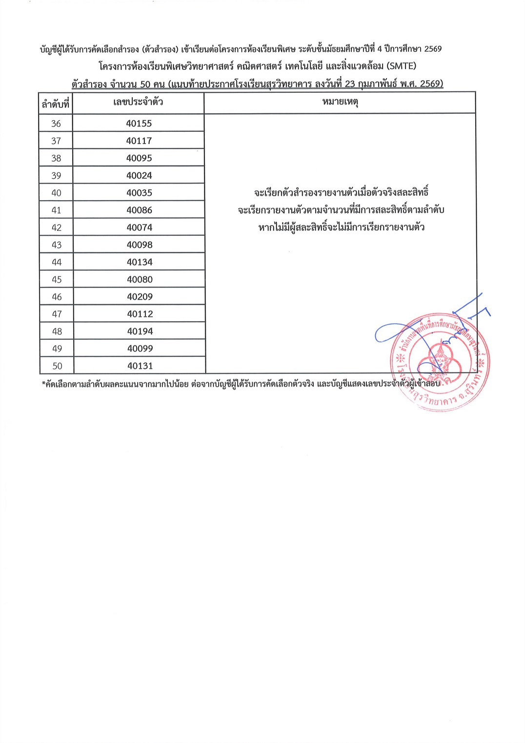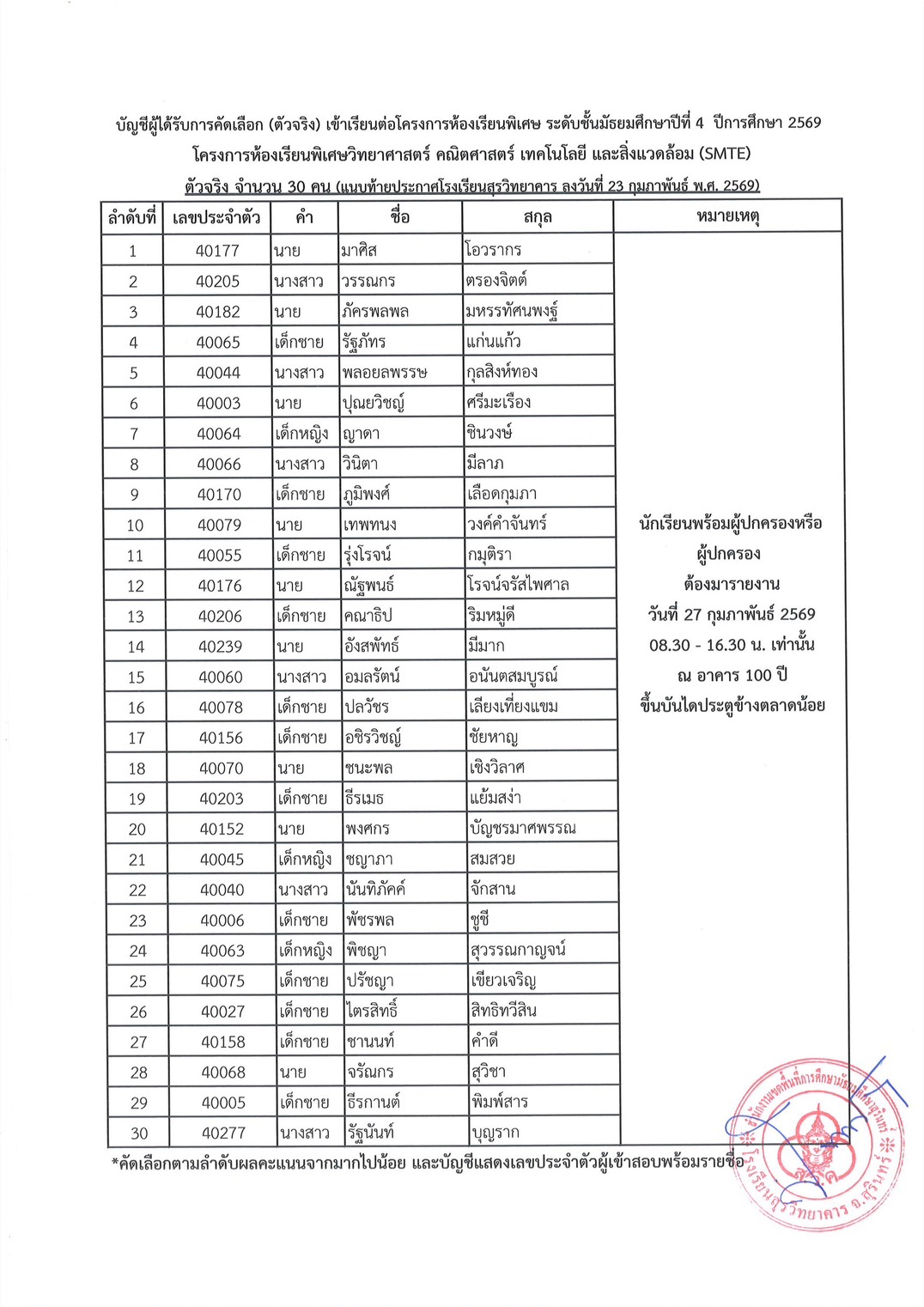 กลุ่มบริหารวิชาการ ข่าวประชาสัมพันธ์ 23 Feb 2026 ประกาศผลการสอบคัดเลือกห้องเรียนพิเศษ SMTE ชั้นมัธยมศึกษาปีที่ 4 ปีการศึกษา 2569 Posted By: webmaster ประกาศผลการสอบคัดเลือกห้องเรียนพิเศษ SMTE ชั้นมัธยมศึกษาปีที่ 4 ปีการศึกษา 2569 Post Views: 104
