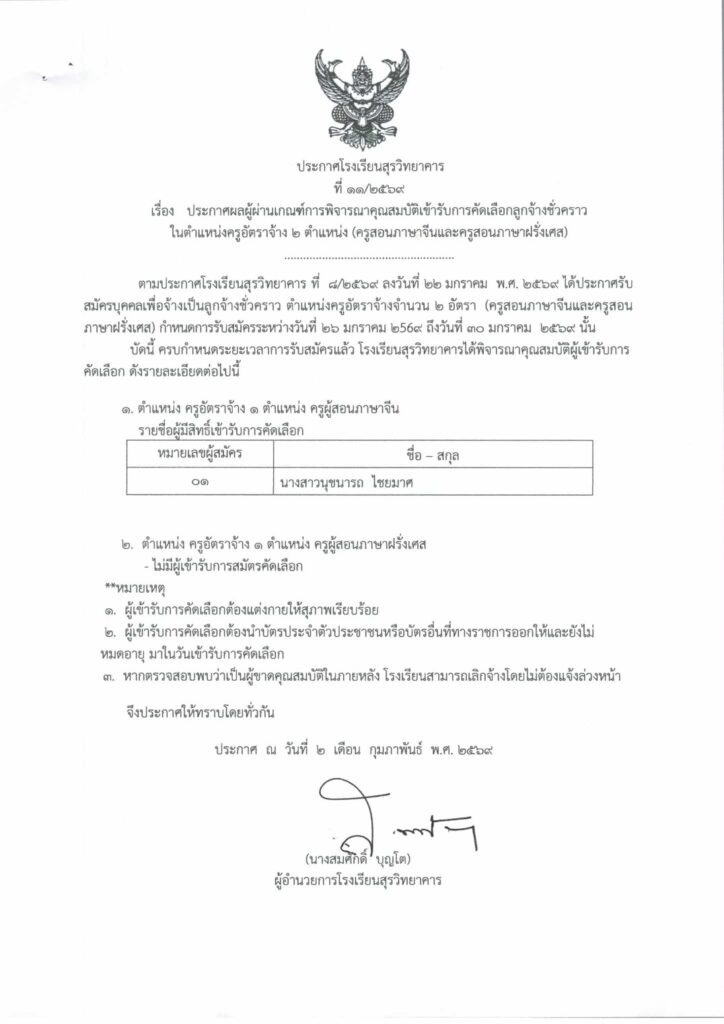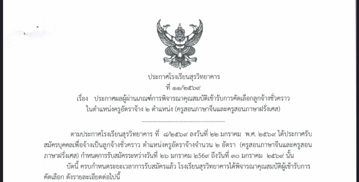 กลุ่มบริหารงานบุคคล 4 Feb 2026 ประกาศผลผู้ผ่านเกณฑ์การพิจารณาคุณสมบัติครูอัตราจ้าง Posted By: webmaster ประกาศโรงเรียนสุรวิทยาคาร เรื่อง ประกาศผลผู้ผ่านเกณฑ์การพิจารณาคุณสมบัติเข้ารับคัดเลือกลูกจ้างชั่วคราว ตำแหน่งครูอัตราจ้าง 2 ตำแหน่ง (ครูสอนภาษาจีนและครูสอนภาษาฝรั่งเศส) ** ดังเอกสารแนบท้าย Post Views: 25